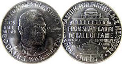 Booker T Washington received a commemorative coin in 1946. The first African American to be honored in this way, revenue from his coin was meant to restore his childhood home.
