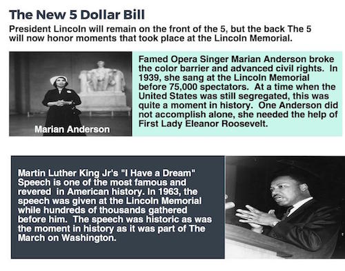 Famed Opera singer Marian Anderson crossed color lines. Though she was unable to use the bathroom at the opera house, internationally she was a superstar. She is slated to be on the back of the $5 bill.